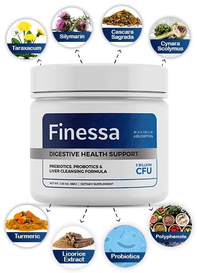 FINESSA is a natural supplement created to support smooth digestion, balanced gut health, liver function, and steady daily energy. Its formula combines ingredients like dandelion, milk thistle, artichoke extract, turmeric, licorice, probiotics, and polyphenols — all chosen for their ability to promote comfort and overall wellness.